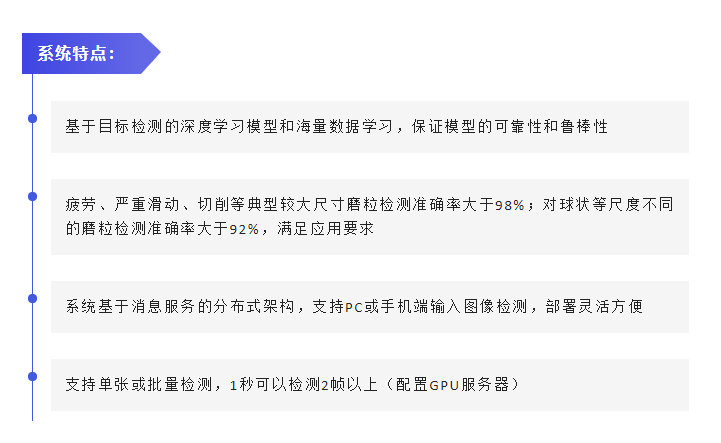 我司研发的磨粒图谱智能检测系统采用先进的机器视觉、深度学习、满足工艺要求的数据扩增技术、消息服务等,适合于厂区内大型设备的状态诊断。